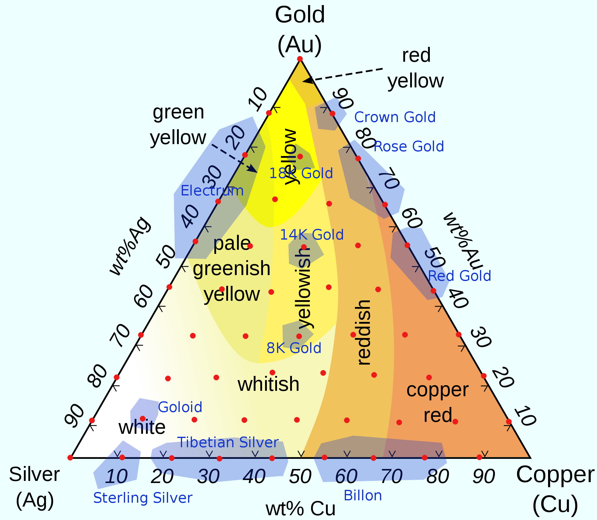Gold - Silver - Copper alloys, with names and result dots for the 3x3 grid